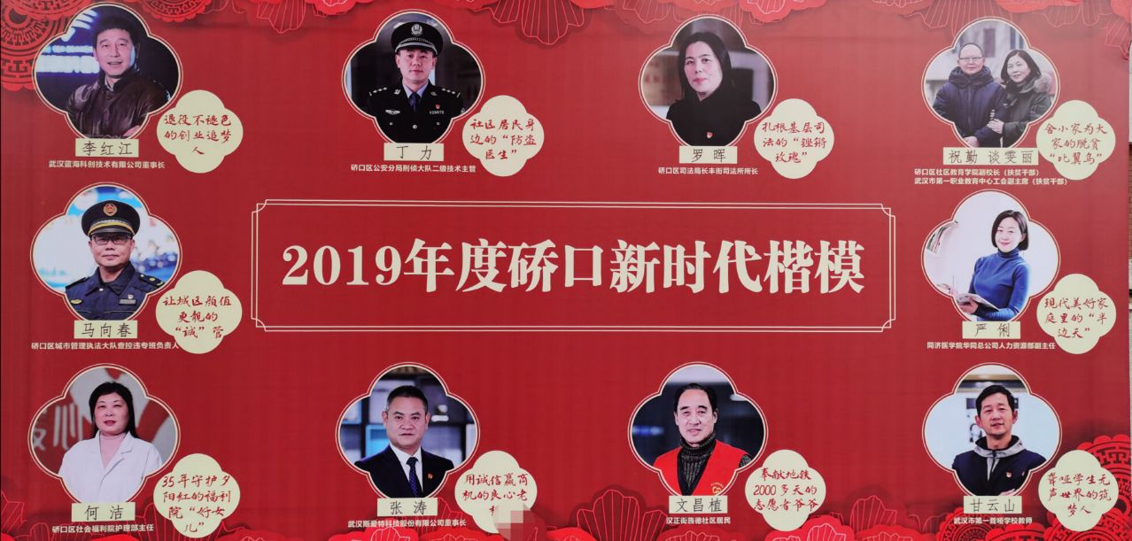 2019年12月根據硚口區委精神文明建設指導委員會《關于在全區開展2019年度“硚口新時代楷模”推評活動的通知》(硚文明委〔2019〕6號)要求按照“動員發動、民主推薦、評選審定”的程序,經區委文明委研究,確定2019年度“硚口新時代楷模”候選人10名,我司董事長張濤同志成功當選“硚口新時代楷模”稱號。