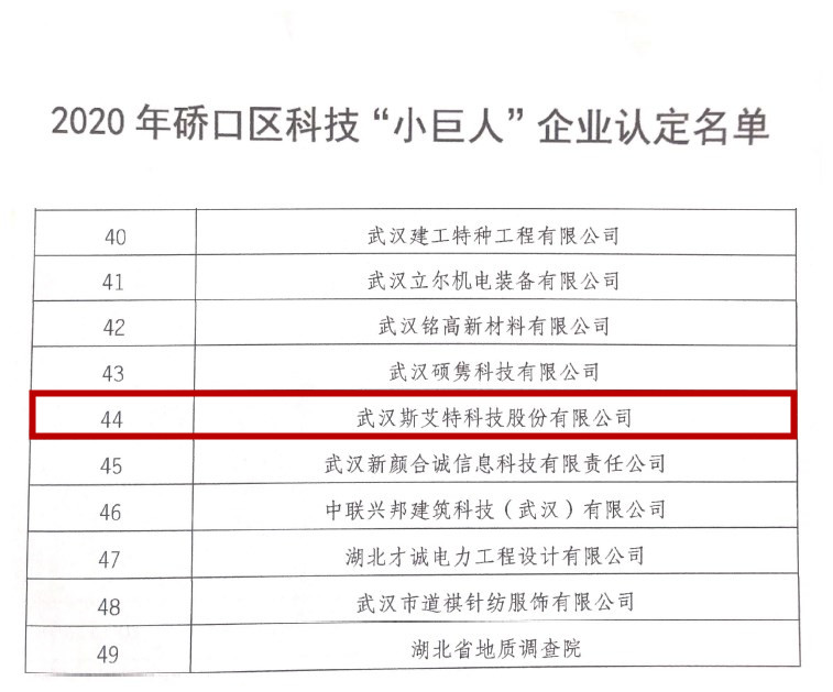 公示名單顯示,此次共49家企業被認定為2020年硚口區科技”小巨人”企業 。斯艾特科技獲此榮譽,是對我們企業的認可和支持,也是促進我們企業創新能力轉化,為服務行業和社會具有重大意義。
