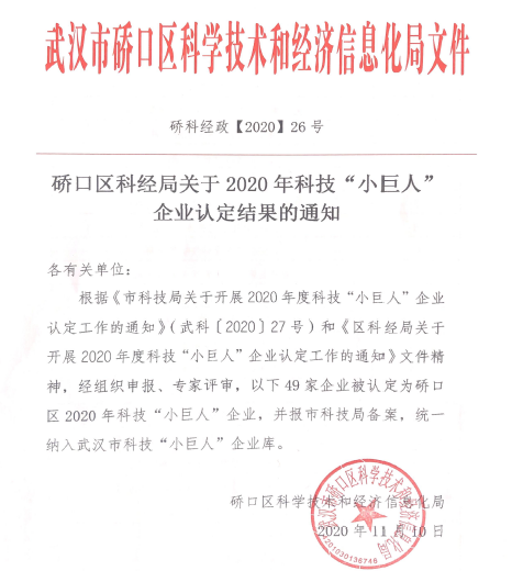 在線留言喜訊!武漢斯艾特獲“硚口區科技小巨人企業”榮譽稱號