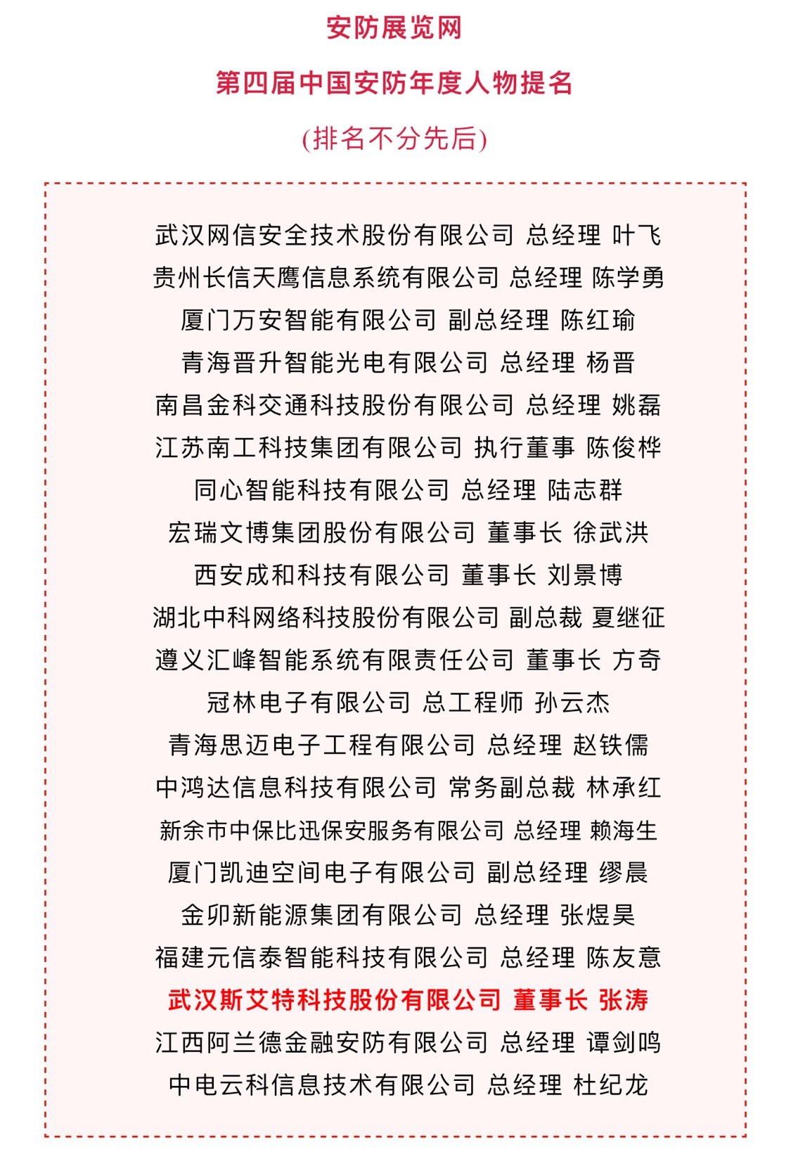 我司董事長張濤同志初次申請該榮譽,榮獲“第四屆中國安防年度人物提名”,也是對從業二十二年,在中國安防領域成績突出,具有較高的行業或社會影響力,為推動行業發展做出突出貢獻者的一個認可,張濤同志作為一名返鄉創業者,始終將企業健康發展、員工成長成才且在漢安居樂業、為社會進步發展作出自身貢獻作為自我的追求并努力踐行,彰顯了一名科技型中小企業家艱苦創業、不屈不饒、默默堅守和奉獻的情懷和使命。